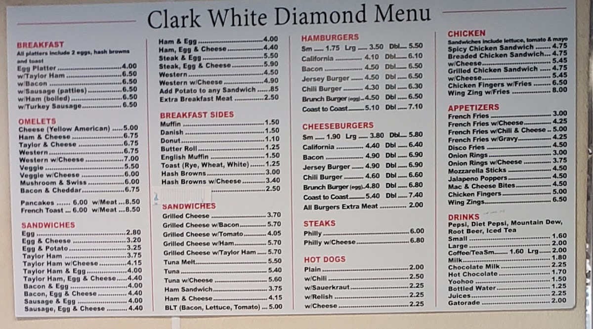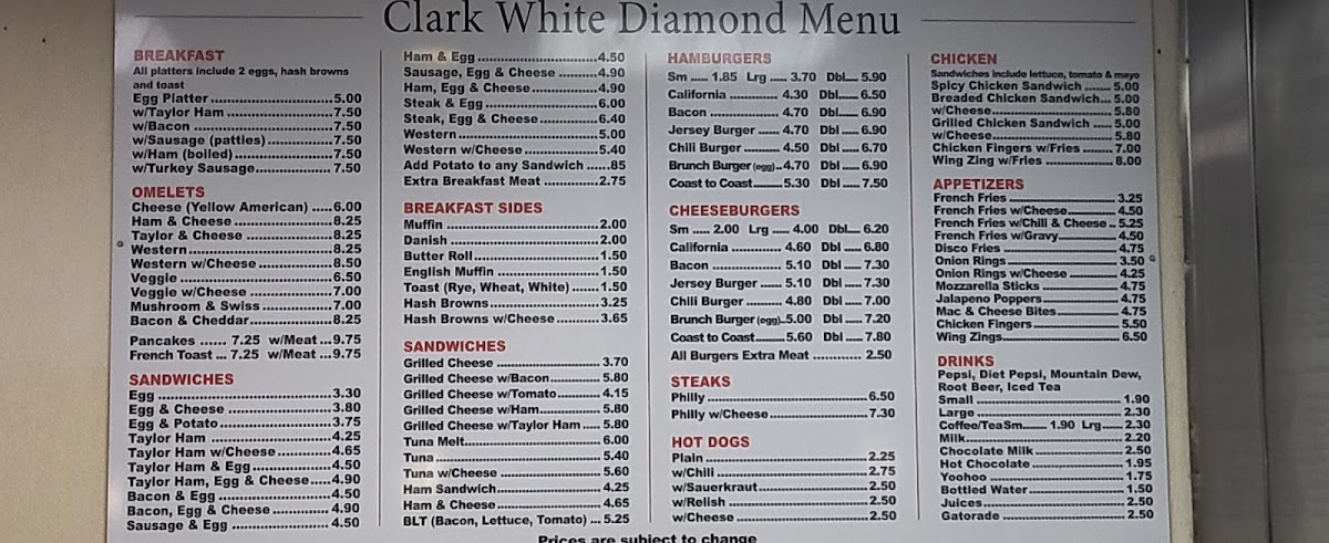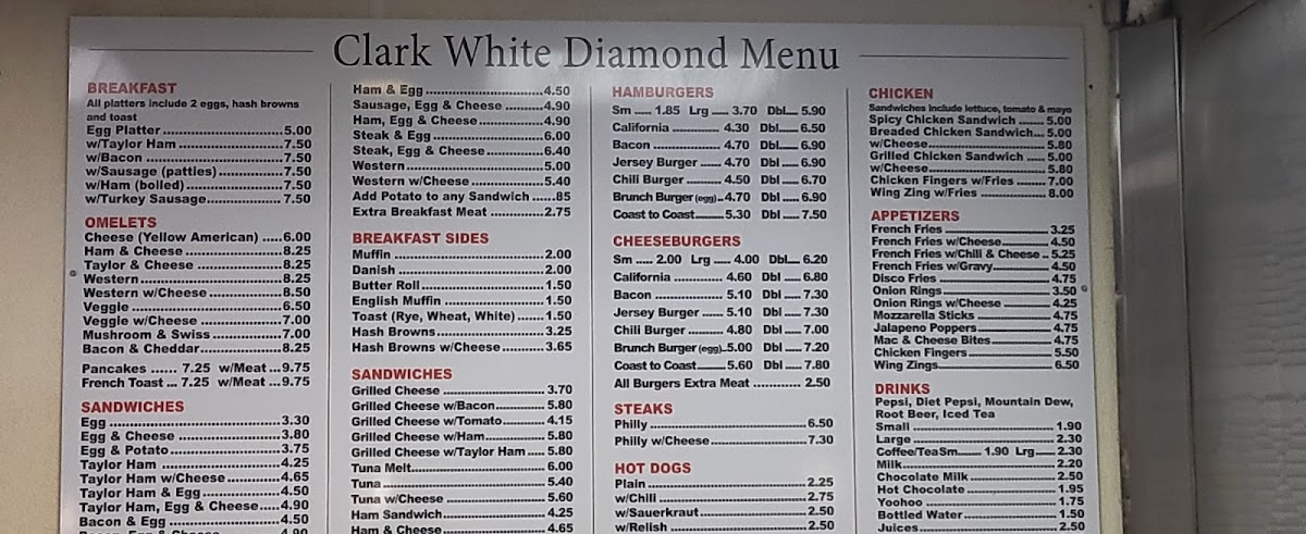 Introducing the menu at Clark White Diamond, a beloved hamburger restaurant nestled in Clark, NJ since 1947. This charming eatery captivatingly blends nostalgia with modern flavor, offering a delectable selection of hamburgers, cheeseburgers, and hot dogs that cater to every palate.