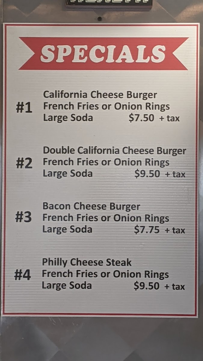 Notable highlights include the mouthwatering Bacon Cheeseburger served on a poppy seed bun, and the California Cheeseburger with crisp lettuce and tomato, praised for their freshness.